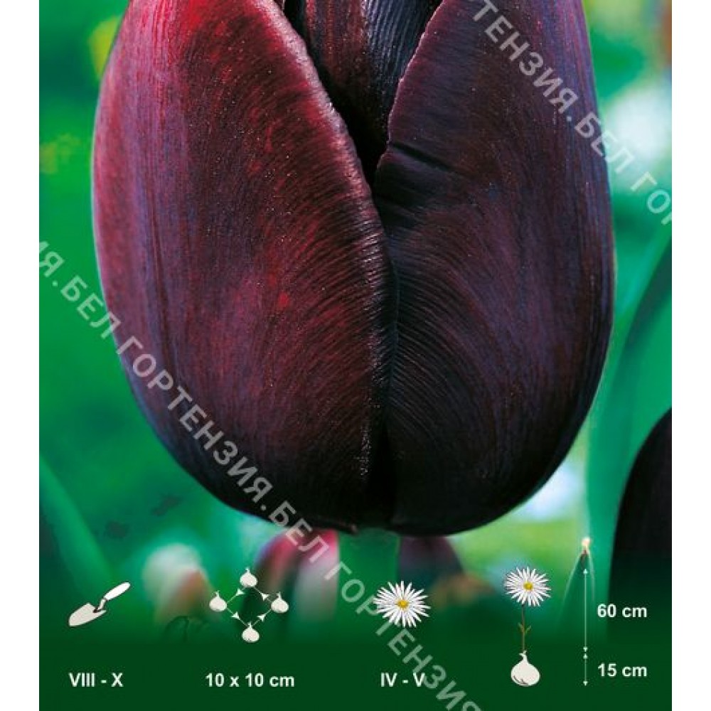 Простые поздние тюльпаны зацветают самыми последними и это одно из их главных достоинств. В эту пору практически все весеннецветущие виды уже заканчивают свое цветение, а другие многолетники еще не начинают, поэтому благодаря этой группе тюльпанов наш участок не останется без цветов. Тюльпаны этого класса имеют классические бокаловидные цветки, прочные цветоносы и разнообразную гамму окрасок. Долго стоят в срезке. Тюльпан Квин оф Найт - один из первых черных тюльпанов. Бокал классической формы, который даже на солнце раскрывается лишь слегка. Окраска цветков очень темная, черно-фиолетовая. Хорошо смотрится на клумбе и в срезке в сочетании со светлыми сортами.