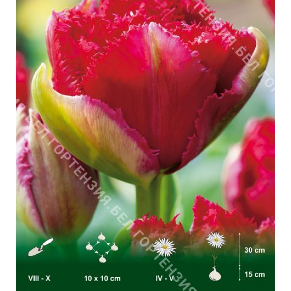 Класс бахромчатых тюльпанов характеризуется среднепоздними сроками цветения и очень оригинальной формой цветков. Лепестки у представителей бахромчатых тюльпанов как будто изрезаны по краю и создают бахромчатую окантовку, что добавляет пышности цветам. Стебли мощные, темно-зеленые. Бахромчатые тюльпаны подходят и для озеленения, и для срезки. Тюльпан Лайон Кинг - необычайно эффектный яркий сорт. Окраска цветков огненно-красная, однотонная, цветок густомахровый, плотный.