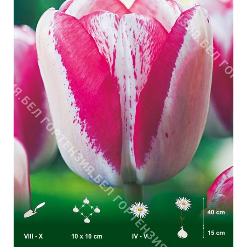 Тюльпаны группы Триумф на сегодняшний день самые популярные. Для этой группы тюльпанов характерны классическая форма крупного бокала цветка, высокие прочные цветоносы, широкая гамма окрасок и продолжительное цветение. Отлично подходят для выгонки. Тюльпан Плэйгёл - сорт с необычной окраской. Белые лепестки ближе к краю приобратают розовый оттенок и переходят в край, украшенный ярко-розовыми точками и штрихами.