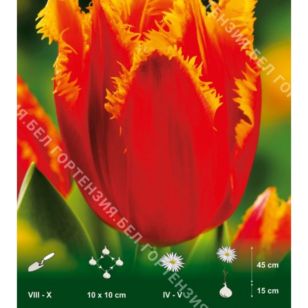 Класс бахромчатых тюльпанов характеризуется среднепоздними сроками цветения и очень оригинальной формой цветков. Лепестки у представителей бахромчатых тюльпанов как будто изрезаны по краю и создают бахромчатую окантовку, что добавляет пышности цветам. Стебли мощные, темно-зеленые. Бахромчатые тюльпаны подходят и для озеленения, и для срезки. Тюльпан Фабио - сорт с бокалом классической формы насыщенной ярко-красной окраски с контрастной желтой бахромой. Выглядит ярко и нарядно, украсит любую клумбу.