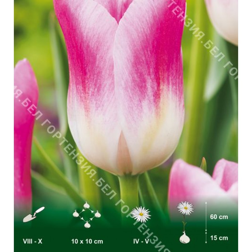 Тюльпаны группы Триумф на сегодняшний день самые популярные. Для этой группы тюльпанов характерны классическая форма крупного бокала цветка, высокие прочные цветоносы, широкая гамма окрасок и продолжительное цветение. Отлично подходят для выгонки. Тюльпан Роял Тен - сорт с классическим крупным бокалом со слегка остроконечными лепестками. Белые у основания лепестки переходят в насыщенный розовый цвет. Цветоносы высокие, крепкие, отлично подходит для срезки.